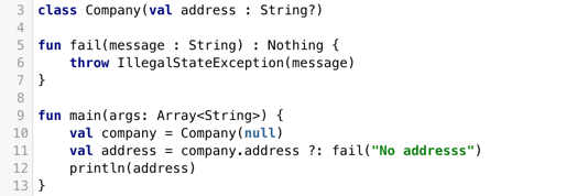 返回Nothing的函数可以放在Elvis运算符的右边来做先决条件检查: