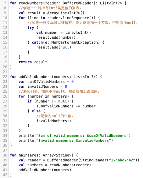 下面我们创建一个包含可空值的集合,之后遍历该集合,打印出有效的数字之和以及为null的集合元素个数: