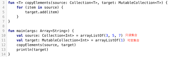 当你有一个使用java.util.Collection做形参的Java方法,可以把任意Collection或MutableCollection的值作为实参传递给这个形参。Java并不会区分只读集合和可变集合,也就是说即使Kotlin中把集合声明成只读的,Java代码也可以修改这个集合,例如下面的代码,虽然我们将printInUppercase接收的list参数声明为只读的,但是仍然可以通过Java代码修改它。