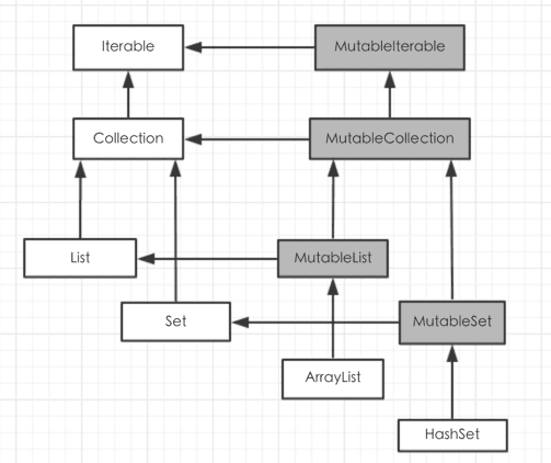 上图中包含了Java类中的ArrayList和HashSet,在Kotlin看来,它们分别继承自MutableList和MutableSet接口,这样既得到了兼容性,也得到了可变接口和只读接口之间清晰的分离。