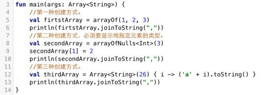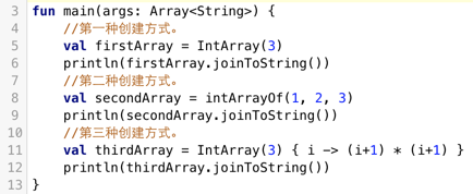 IntArray的intArrayOf,以及其他数组类型的函数)接收变长参数的值并创建和存储这些值的数组。 - 另一种构造方法,接收一个大小和一个用来初始化每个元素的