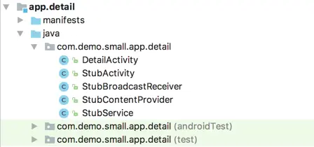 DetailActivity是插件的入口,而以Stub开头的四个类分别为Activity/Service/ContentProvider/BroadcastReceiver,我们需要在宿主分身模块中对其进行声明。