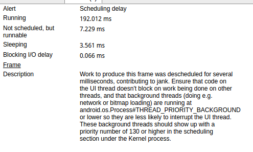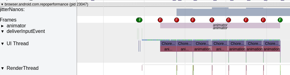之后,按照上面的方法导出systrace文件,找到我们应用包名所对应的进程,可以看到许多红色F,这些就表明遇到了卡顿,如果正常时应当是绿色,如果出现了轻微卡顿,那么为黄色,严重卡顿则为红色: