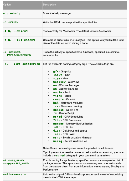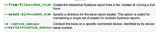 systrace.py提供了很多可配置的参数,下面是官方文档中对于参数的说明,在使用2.2方式的时候,我们可以根据需要选取参数进行配置: