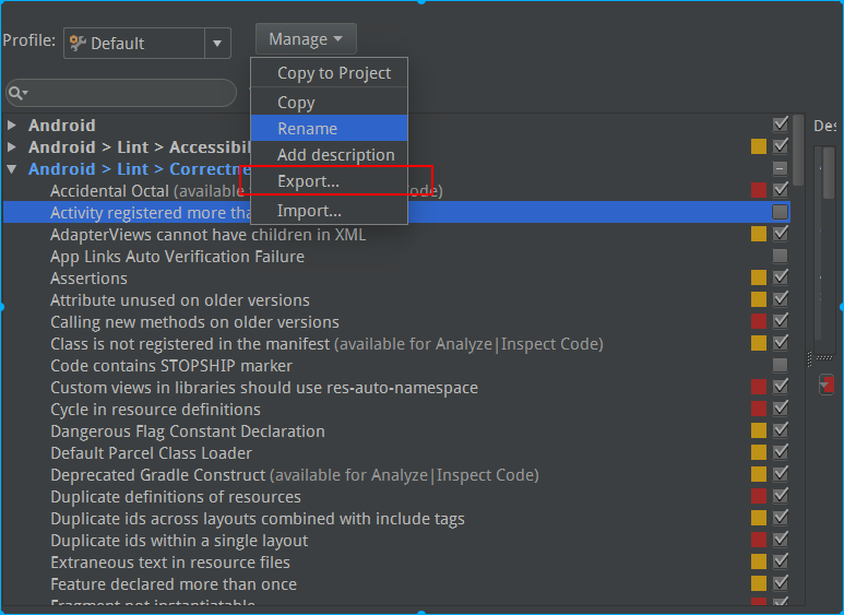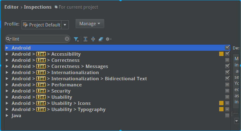 选File -> Settings,在其中搜索lint,可以得到如下的界面: