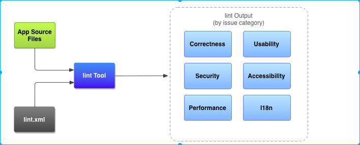App Source Files:对应于我们工程当中的源文件,包括Java代码、XML文件、Icons图片、ProGuard configuration files。lint.xml:定义了需要检查的问题,以及该问题对应的等级。lint tool:静态的代码扫描工具,我们可以从命令行或者Android Studio中启动,它会根据lint.xml中定义的规则,来检查App Source Files中的代码。lint检查结果:把lint tool检测出的问题分为不同的类别,方便开发者修复,目前问题分为以下几类: