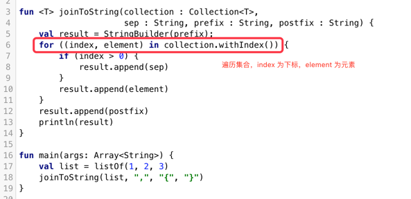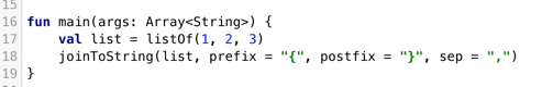 在上面的例子中,我们指定了分隔符、前缀和后缀三个参数,但是对于这个函数的使用者来说,如果不去看这些函数的声明,很难看出这些String类型的含义,这时候就可以使用 命名参数 的方法来调用,这有两点好处: