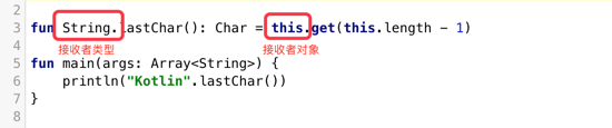 扩展函数 其实是一个类的成员函数,只不过它定义在类的外面,我们所需要做的,就是在声明扩展函数的时候,把需要扩展的类或者接口的名称,放到它的前面,用来调用这个扩展函数的对象,就叫做 接收者对象。