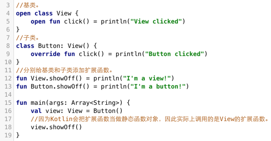 这里假设我们有两个类,View和Button,其中Button继承于View,我们给这两个类都添加一个名为showOff的扩展函数。