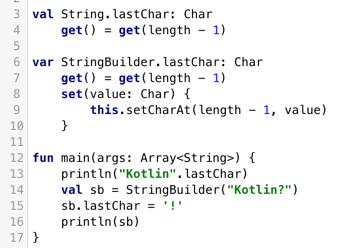 下面我们给String类添加一个扩展函数,返回它的最后一个字符: