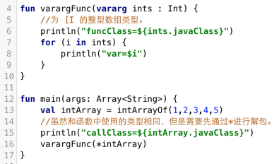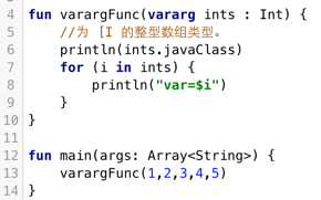 使用关键字 vararg,可以用来声明一个函数将有可能有任意数量的参数,下面例子中,我们定义一个可以接收可变数量Int类型的函数,之后和在Java中一样,它会被转换为[I的整型数组类型: