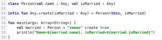 中缀调用可以与 只有一个参数的函数 一起使用,无论是普通的函数还是扩展函数,要允许使用中缀符号调用函数,需要使用infix修饰符来标记它,下面是一个创建Person的函数,我们采用了扩展函数的方法,这里的Any是Kotlin中所有类的父类,和Java中的Object相同: