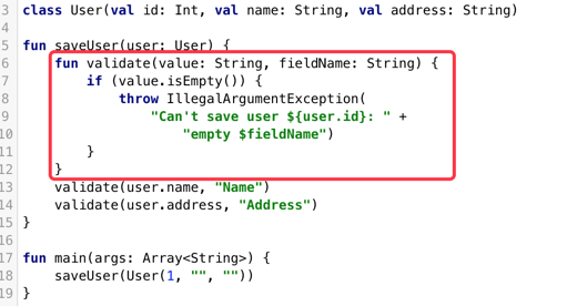 在Java的一个函数当中,有可能存在重复代码,例如在注册模块中,可能需要校验输入的多个字段是否有效,那么校验的逻辑就可以提取出一个函数,而Kotlin就提供了一种方法:可以在函数中嵌套这些提取的函数,局部函数定义方式和普通函数是相同的。
