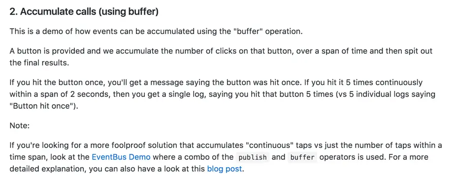 2s内连续点击了一个按钮五次,那么我们只会收到一个“你点击了该按钮五次”的时间,而不是五个"你点击了该按钮"的事件。这个示例的目的是让我们学会如何应用buffer操作符。