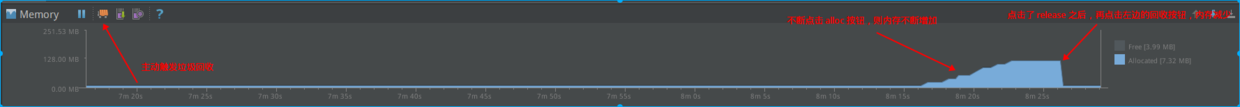 release之后,内存并不会立刻下降,而是需要点击左边的“垃圾车”按钮来主动触发垃圾回收,这时候可以看到曲线立刻下降,说明此时触发了垃圾回收过程。 - 视图中分为两个部分: