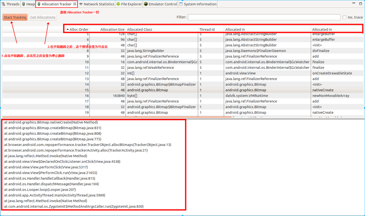 Allocation Tracker是用来记录一段时间内的内存分配情况,并且它可以列出分配对象的大小,以及是由哪个函数分配的。