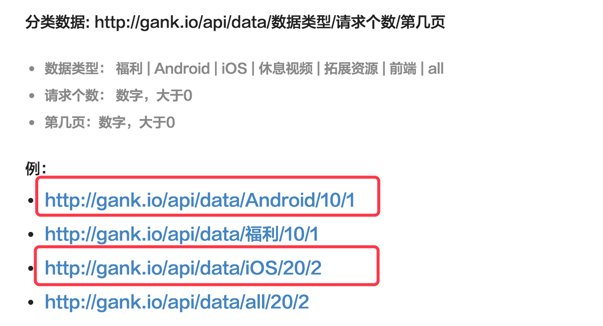 首先来熟悉一下所用到的测试接口,其数据来自于 干货集中营,这里选择Android和iOS两类的资讯,通过接口的描述,可以知道发起请求时的变量包含三个:
