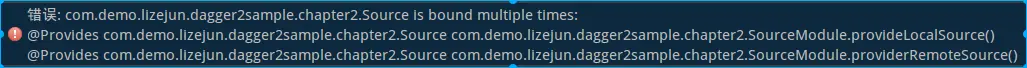 这是因为Dagger2在寻找mLocalSource的创建方法时,它会去Component关联的Module中(也就是SourceModule)寻找返回类型为Source的方法,但是在SourceModule中,provideLocalSource / providerRemoteSource这两个方法返回的类型都为SourceModule,导致无法确定使用哪个方法来创建mLocalSource。