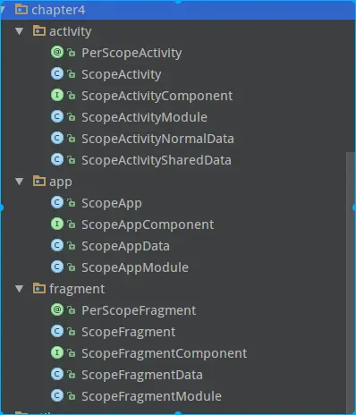 为了让大家更好的验证上面关于@Scope的解释,下面用一个Demo来演示,完整代码可以从 Dagger2Sample 的第四章获取,这个Demo包括三个大部分:
