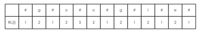 在上面我们已经介绍过,回文串中最左或最右位置的字符与其对称轴的距离称为 回文半径,Manacher定义了一个数组RL[i],它表示 第i个字符为对称轴的回文串 的 最右一个字符与字符i的闭区间所包含的字符个数,以google为例,经过处理后的字符串为#g#o#o#g#l#e,那么RL[i]的值为: