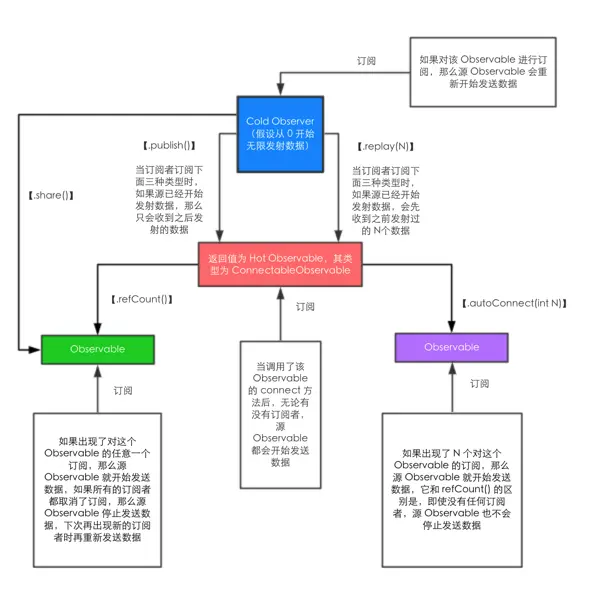 如果使用.publish()创建,那么订阅者只能收到在订阅之后Cold Observable发出的数据,而如果使用reply(int N)创建,那么订阅者在订阅后可以收到Cold Observable在订阅之前发送的N个数据。
