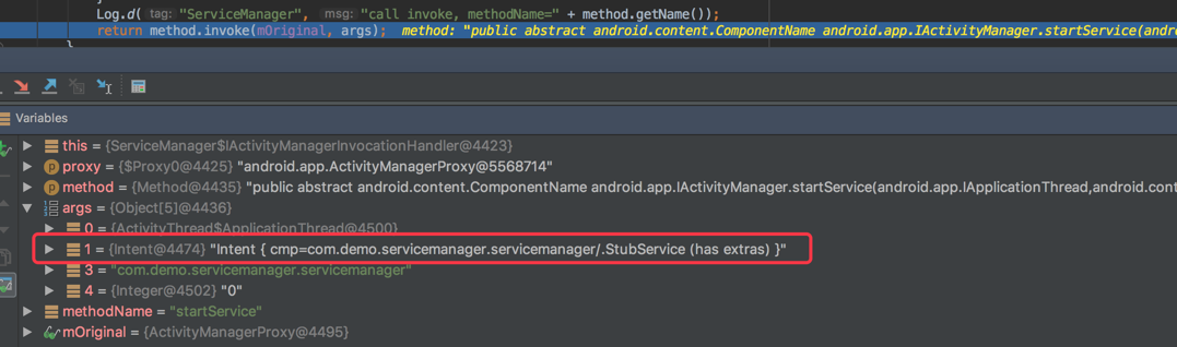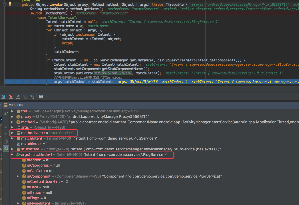 先看startService,args参数中保存了startService所传入的实参,这里面就包含了启动插件Service的Intent,我们将目标Intent的Component替换成为占坑的Component,然后将原始的Intent保存在KEY_ORIGINAL_INTENT字段当中,最后,通过原始的对象调用到ActivityManagerService端。