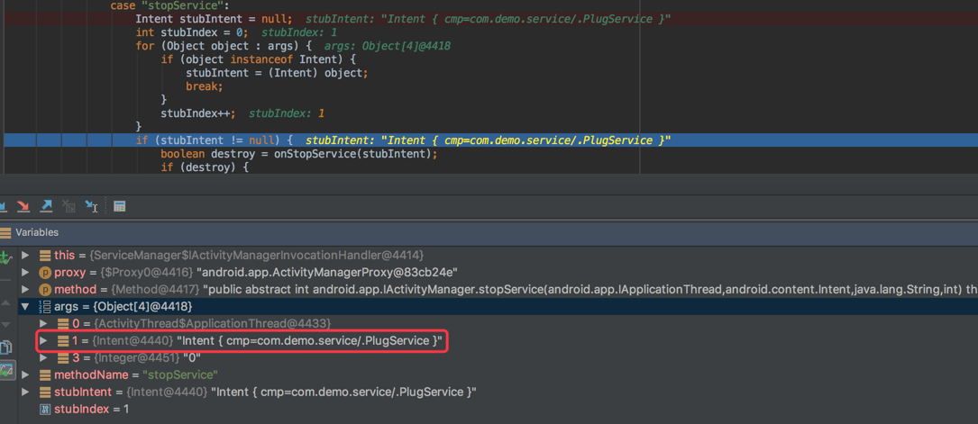 按照前面的分析,首先会走到我们预设的“陷阱”当中,可以看到,这里面的Intent还是插件Service的Component名字: