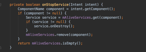 onStop方法中,我们判断它是否是需要停止插件Service,如果是那么就调用插件Service的onDestory()方法,并且判断与占坑Service相关联的插件Service是否都已经结束了,如果是,那么就返回true,让占坑Service也销毁。