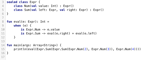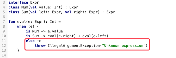 之前在介绍when表达式的时候,我们用了一个表达式的例子,Num和Sum继承于基类Expr,分别表达数字和两个表达式之和,而对于不属于Expr的子类,我们需要提供额外的else操作符。