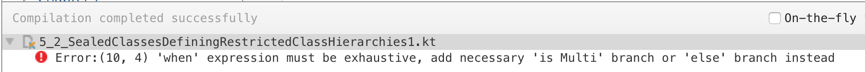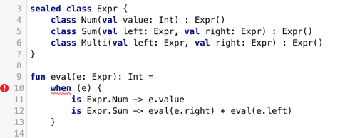 when表达式中已经处理了所有Expr的子类,就不再需要提供默认的分支,假如这时候我们给Expr添加一个新的子类Multi,但是不修改when中的逻辑,那么就会导致编译失败: