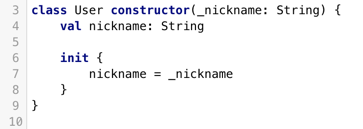 nikename的声明结合,因此可以去掉init语句。 - 如果主构造方法没有注解或可见性修饰符,可以取消