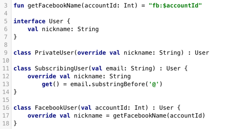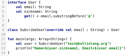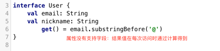 PrivateUser:直接在主构造方法中声明了这个属性,这个属性实现了来自于User的抽象属性,所以要标记为override。SubscribingUser:通过一个自定义的getter实现,这个属性没有一个支持字段来存储它的值,它只有一个getter在每次调用时从email中得到昵称。FacebookUser:在初始化时,将nickname属性与值关联。