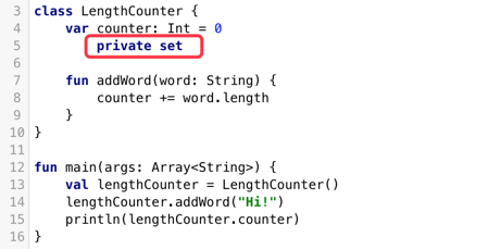 访问器的可见性默认与属性的可见性相同,但是如果需要可以通过在get和set关键字前放置可见性修饰符的方式来修改它,例如在下面的例子中,我们将setter的可见性修改为private:
