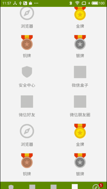 对于2.1中例子的Item 1,它的BackgroundStyle为BACKGROUND_STYLE_STATIC,因此在它被选中的时候,文字和图片的颜色为给它设置的ActiveColor,而整个BottomNavigationBar的背景色为BackgroundColor,现在我们看一下BACKGROUND_STYLE_RIPPLE的情况: