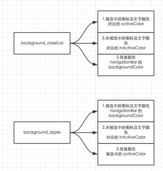 注意到,上面这三种颜色并不是说被选中的Item的文字和图标的颜色一定是被激活颜色,这需要根据BackgroundStyle来决定,在每种模式下,被选中Item的文字图片颜色、未被选中的Item的文字图标颜色、整个BottomNavigationBar的背景颜色的对应关系为: