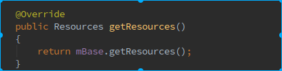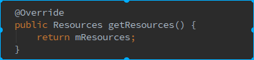 当我们调用在Activity/Service/Application中调用getResources()时,由于它们都继承于ContextWrapper,该方法就会调用到ContextWrapper的getResources()方法,而该方法又会调用它内部的mBase变量的对应方法: