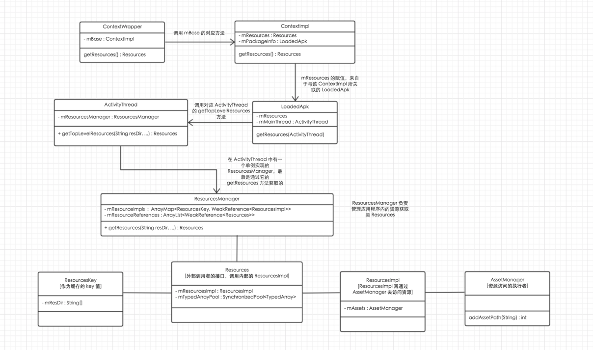 ResourcesImpl:资源访问的实现类,其内部包含了一个AssetManager,所有资源的访问都是通过它的Native方法来实现的。Resources:ResourcesImpl的代理类,对于资源的使用者来说,看到的是Resources接口,其实在构建Resources对象时,同时也会创建一个ResourcesImpl对象作为它的成员变量,Resources会调用它来去获取资源。AssetManager:作为资源获取的执行者,它是ResourcesImpl的内部成员变量。