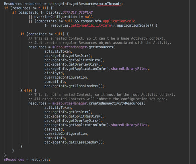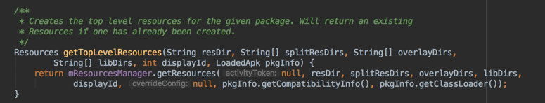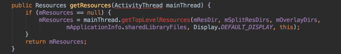 LoadedApk中会通过调用ActivityThread的getTopLevelResources方法来为mResources变量赋值,在调用的时候会传入LoadedApk中的一些信息: