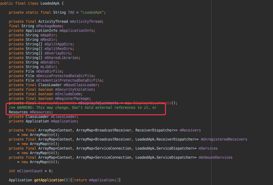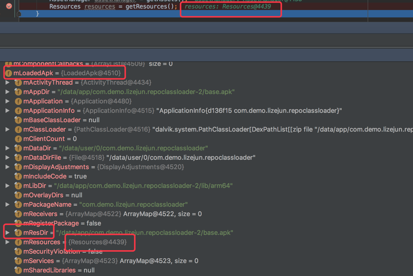 packageInfo的类型为LoadedApk,LoadedApk是对于.apk解析的结果,它内部包含了所关联的ActivityThread,安装后拷贝到的目录,我们在ContextImpl中赋值的其实就是它内部的mResources对象: