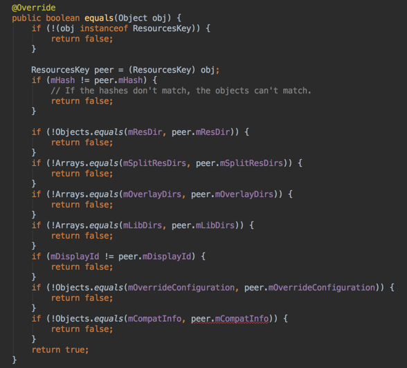 ResourcesKey:作为缓存的Key,也就是说对于一个应用程序,可以保存不同的Resource,是否返回之前的Resources对象,取决于ResourcesKey的equals方法是否相等: