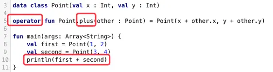 Point类定义了一个扩展函数plus,这样当我们调用first + second,实际上执行的是first.plus(second)方法来得到一个新的Point对象。这里需要注意的是:用于重载运算符的所有函数都需要 用 operator 关键字来标记,用来表示你打算 把这个函数作为相应的约定的实现。