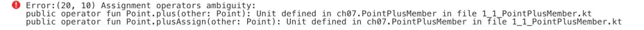 当在代码中用到+=的时候,理论上plus和plusAssign都可能会被调用,如果两个函数都有定义并且适用,那么编译器就会报错,例如下面这样的定义: