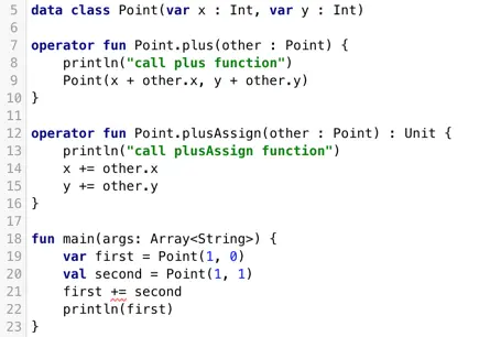 当在定义像plus这样的函数,Kotlin不止支持+号运算,也支持像+=这样的 复合赋值运算符。