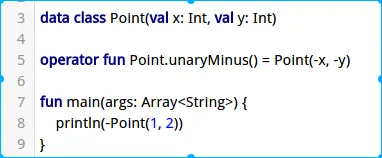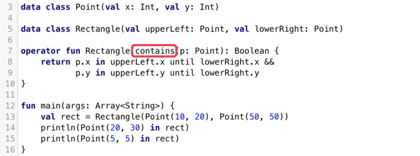 Kotlin没有为标准数字类型Int,Long等定义任何位运算符,因此也不允许你为自定类型定义它们。相反,它使用中缀调用语法的函数,可以为自定义类型定义相似的函数,下面我们为Point添加一个and,用于执行位运算。