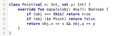 如果在Kotlin中使用==/!=运算符,它将被转换成equals方法的调用,和其他运算符不同的是,==和!=可以用于可空运算数,比较a == b会检查a是否为飞空,如果不是就调用a.equals(b),完整的调用如下所示: