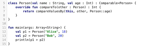 与算术运算符一样,在Kotlin中,可以对任何对象使用比较运算符(==、!=、>和<),而不仅仅限于基本数据类型。