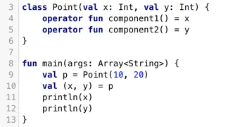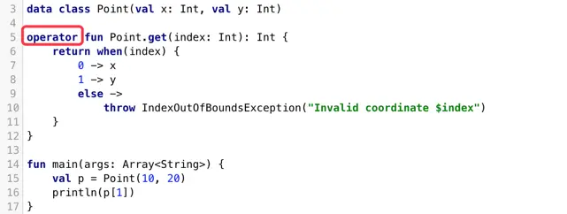 在Kotlin中,下标运算符是一种约定,使用下标运算符读取元素会被转换为get运算符方法的调用,并且写入元素将调用set,下面我们为Point类添加类似的方法: