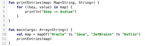 解构声明不仅可以用作函数中的顶层语句,还可以用在其他可以声明变量的地方,例如使用in循环来枚举map中的条目: