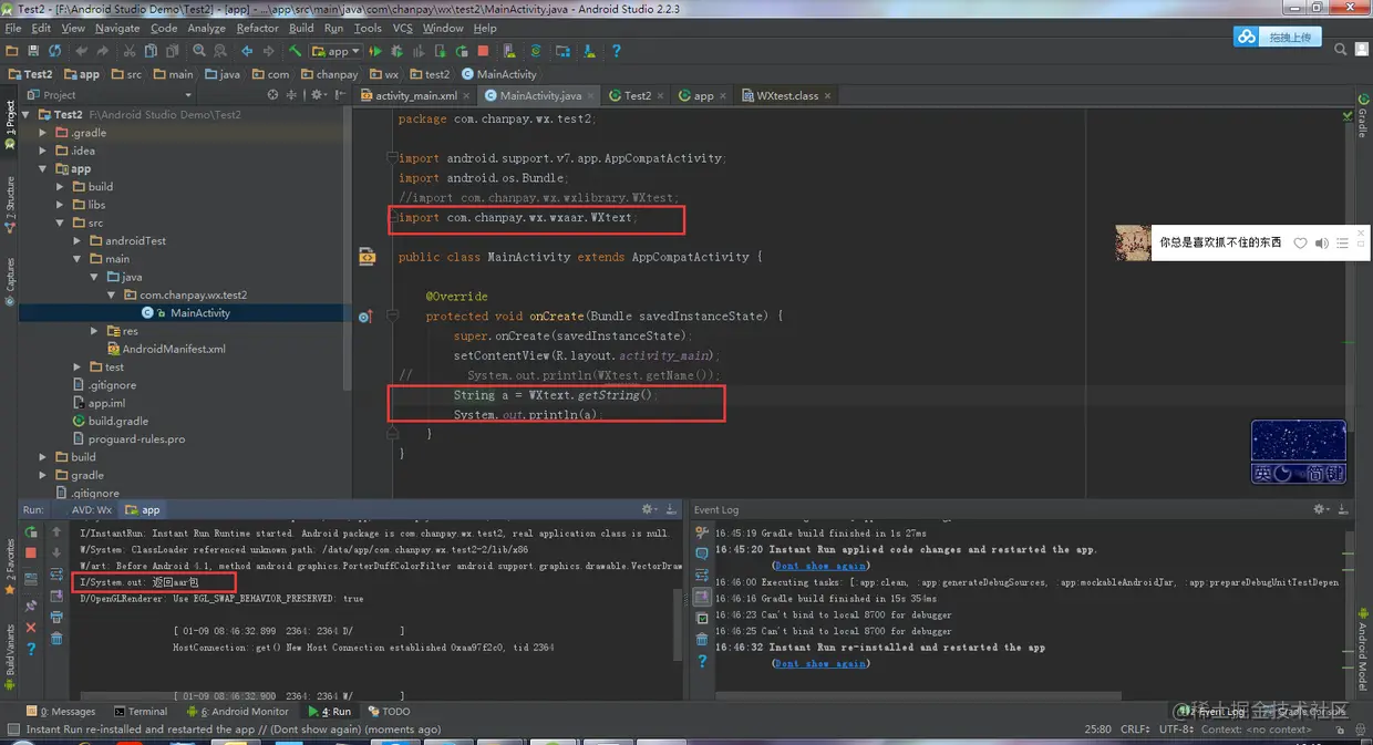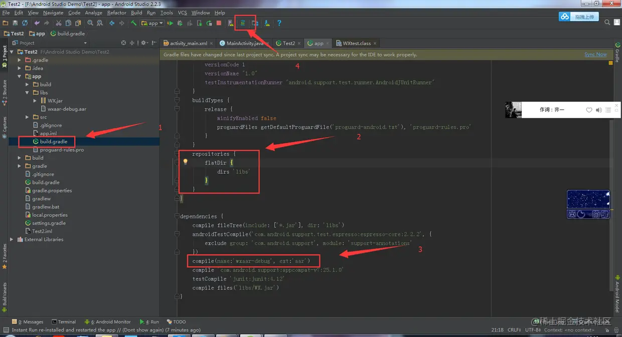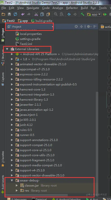 Android studio如何使用jar/aar包(二) XingXiaoWu 2017-12-13 610 阅读1分钟 上一篇说到如何创建jar/aar,这篇介绍如何使用 一 jar的使用 jar包的使用很简单,直接将jar包拷如lib目录下 运行完之后我们试一下 使用成功。 二 aar包的使用 同样先导入libs目录下 然后对gradle进行修改 repositories { flatDir { dirs'libs' } } compile(name:'wxaar-debug',ext:'aar') 在4运行完成后 这里会多出一个外部依赖包,说明成功依赖。接下来我们试一下 运行成功。