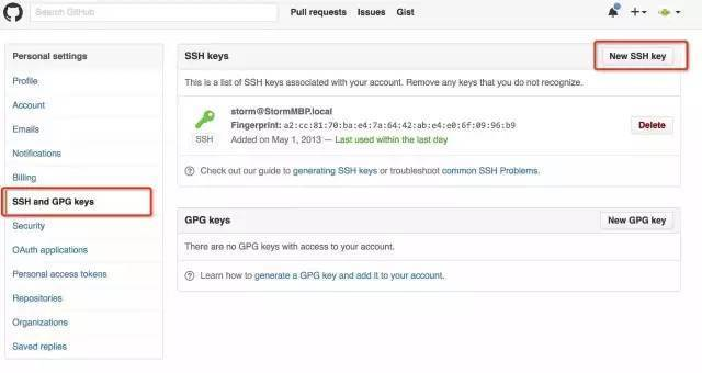 第一步先在 GitHub 上的设置页面,点击最左侧 SSH and GPG keys :